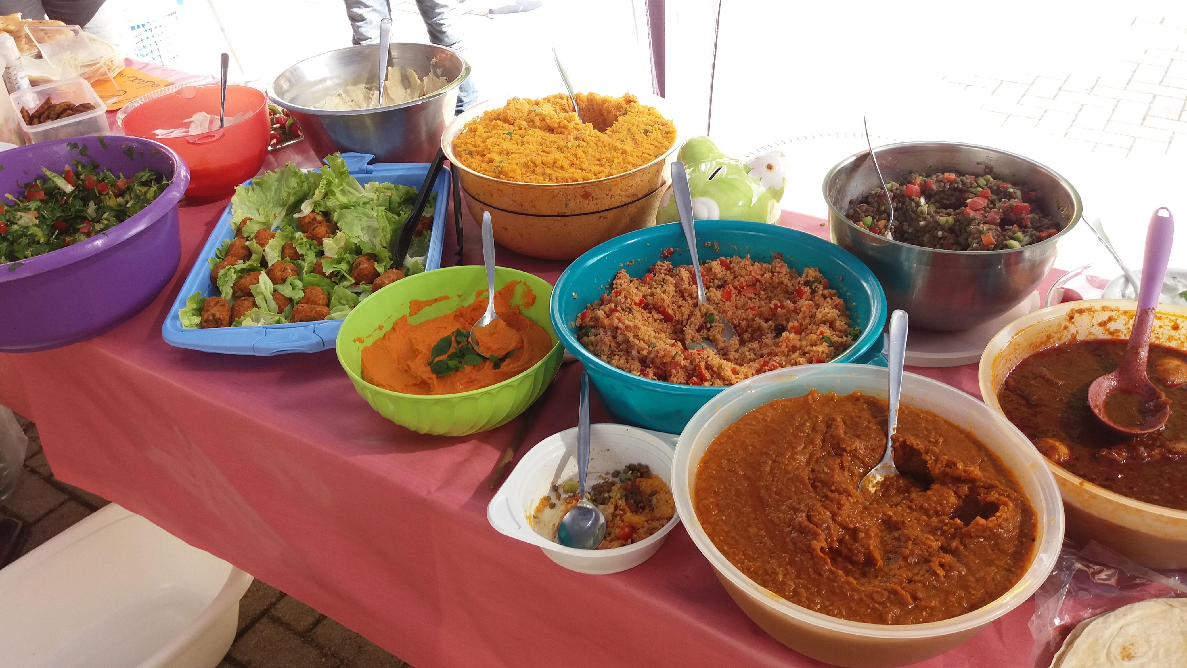 Es werden köstliche Salate verkauft, meist von den Flüchtlingen hergestellt