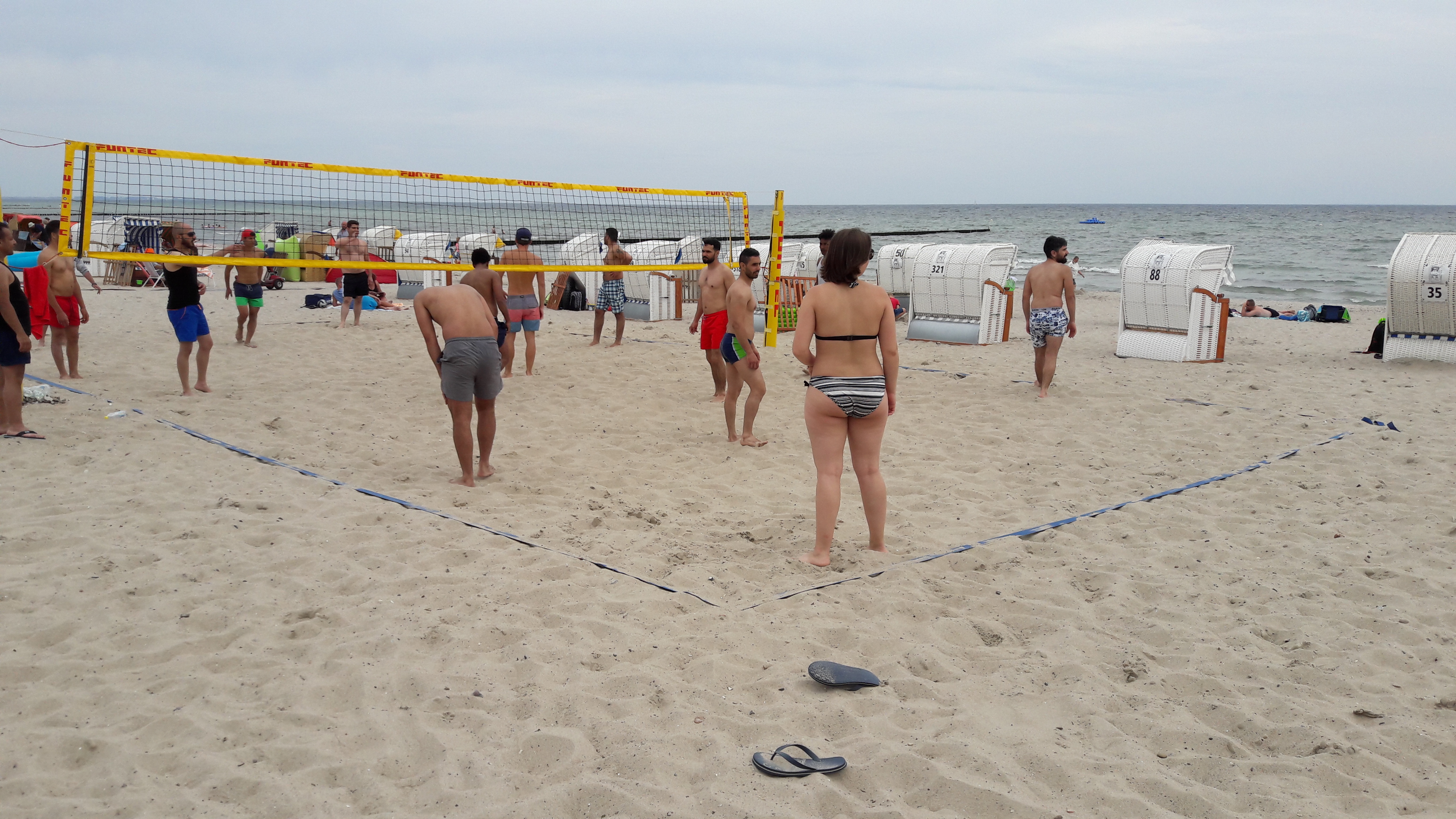 Die Kinder waren die ersten, die im Wasser waren; und als die Erwachsenen sahen, dass das Wasser nur nass und nicht sehr kalt war, gab’s auch für sie kein Halten mehr. Es wurde geschwommen, getobt, getaucht und Ringkampf „gespielt“. Die Volleyballer kämpften um den Sieg (es wurde ein gerechtes Unentschieden), die Fußballer übten den Fallrückzieher, fielen in weichen Sand und die Kleinsten versuchten sich im Bauen von Sandburgen. Die Sonne verhalf dem Einen und Anderen zu einem leichten Sonnenbrand. Es wurde viel geredet und gelacht. Für das leibliche Wohl war auch gesorgt: gebratene „Hühnerbeine“, Frikadellen und Mineralwasser haben alle ausreichend versorgt.